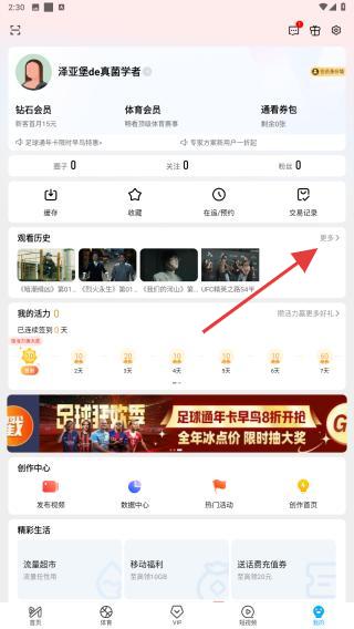 2、在个人中心页面中,找到观看历史的板块,点击其右侧的更多的按钮。