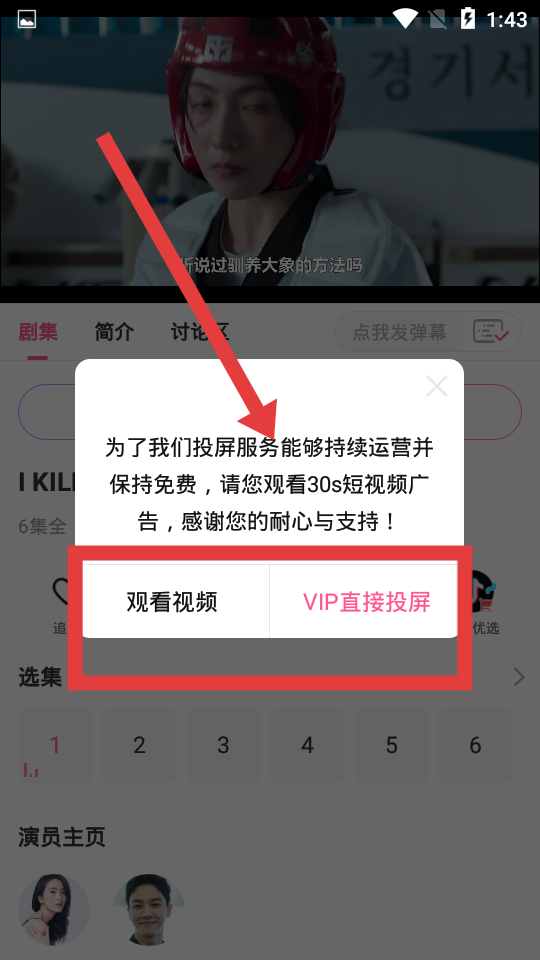 3、根据系统弹窗可以选择观看30s视频完成投屏,或者通过充值VIP的方法投屏,然后选择要投屏的电视设备即可。