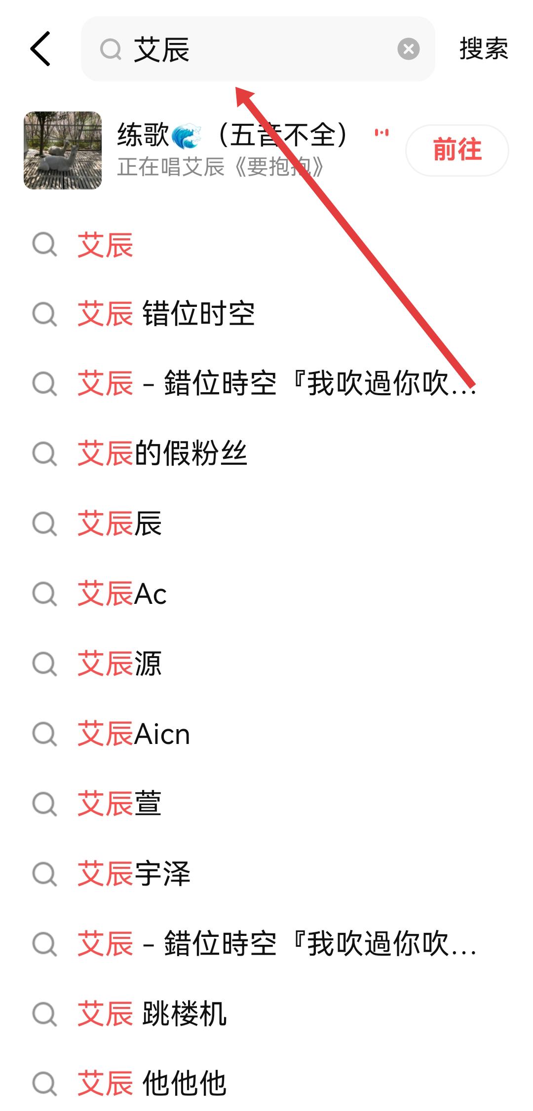 2、在k歌的搜索栏中输入自己需要关注的K歌号名称如艾辰,查看搜索的结果。