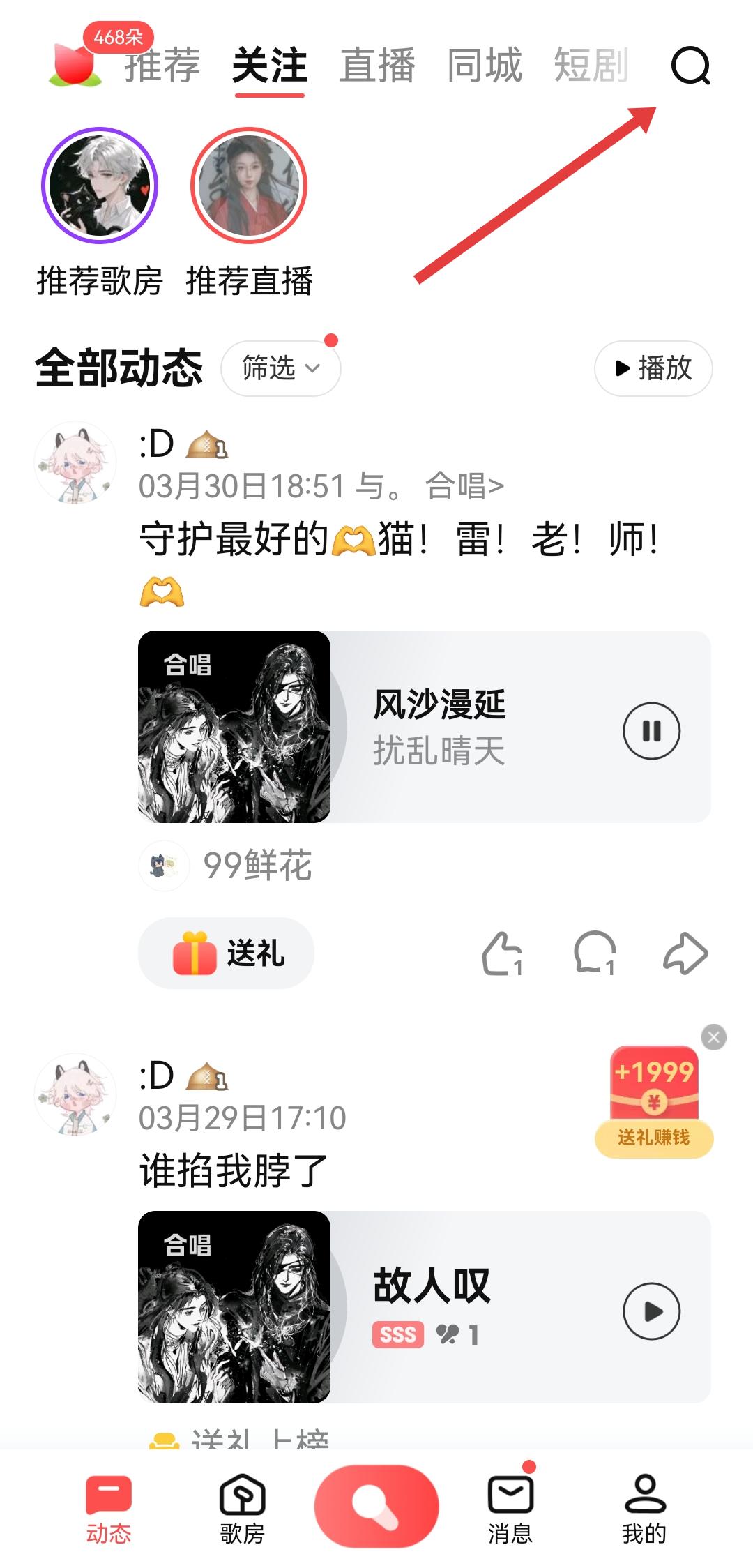 1、进入全民K歌动态的页面,需要点击右上角的搜索图标,进入搜索的界面。