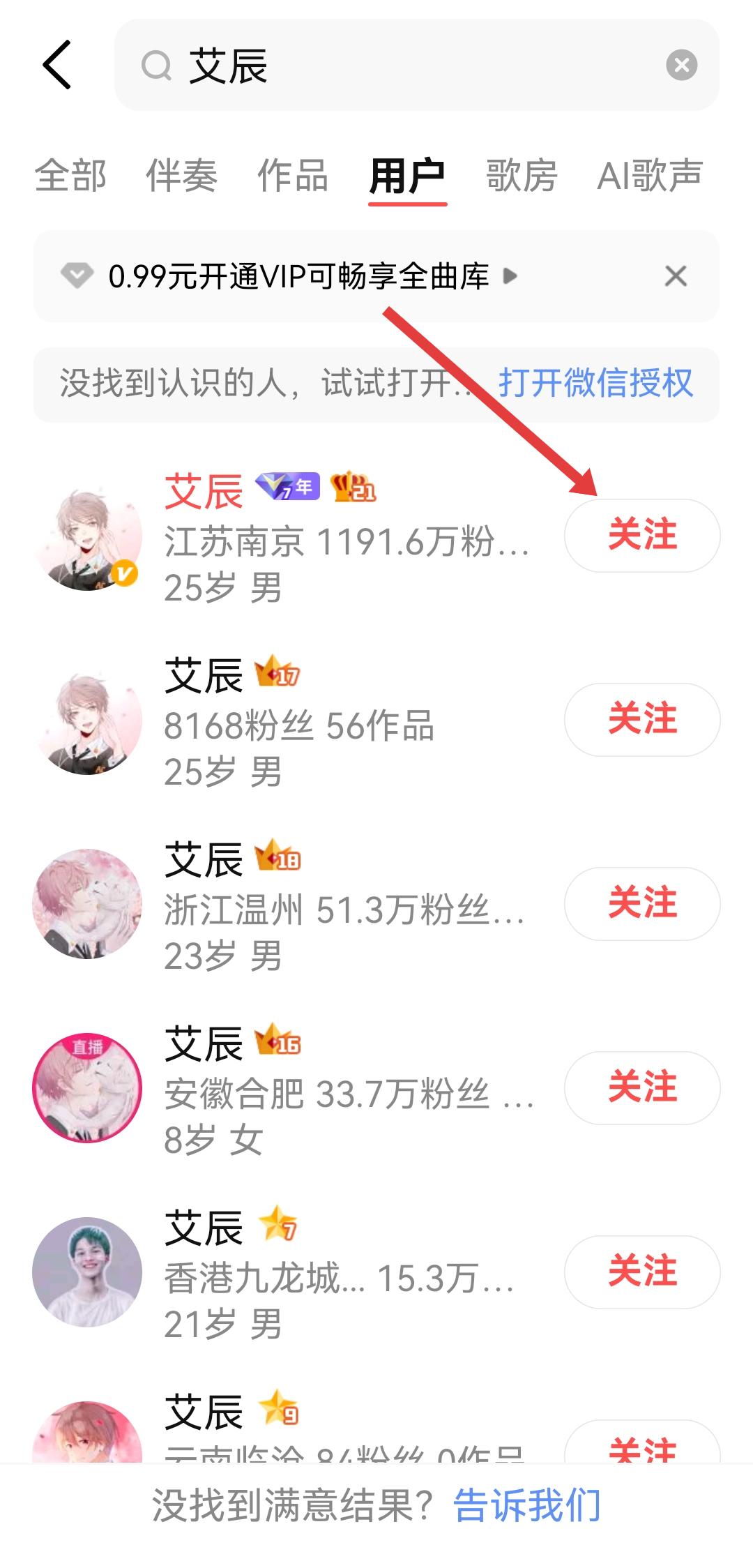 3、在搜索结果的用户列表中,找到目标K歌号,点击其右侧的关注按钮,即可关注该K歌号。