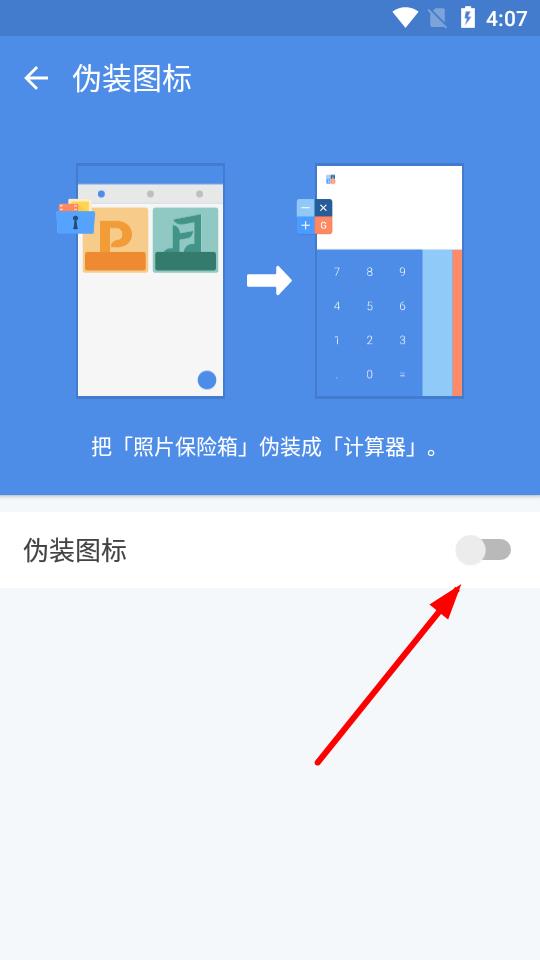 3、在伪装图标设置页面,点击开启伪装图标后的开关按钮。