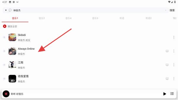 3、点击搜索后,会呈现歌手的热门歌曲,用户可任需点击进行播放。