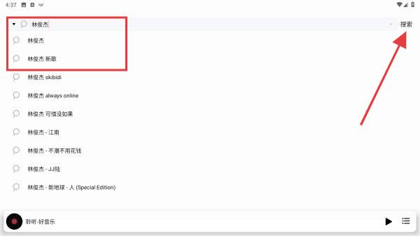 2、在输入框内搜索你想要听歌的歌手名字,点击搜索即可查找。