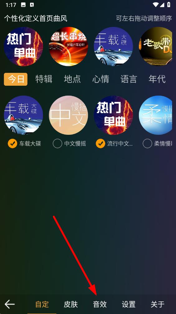 2、在页面下方的导航栏中,点击音效选项,进入音效调节界面。