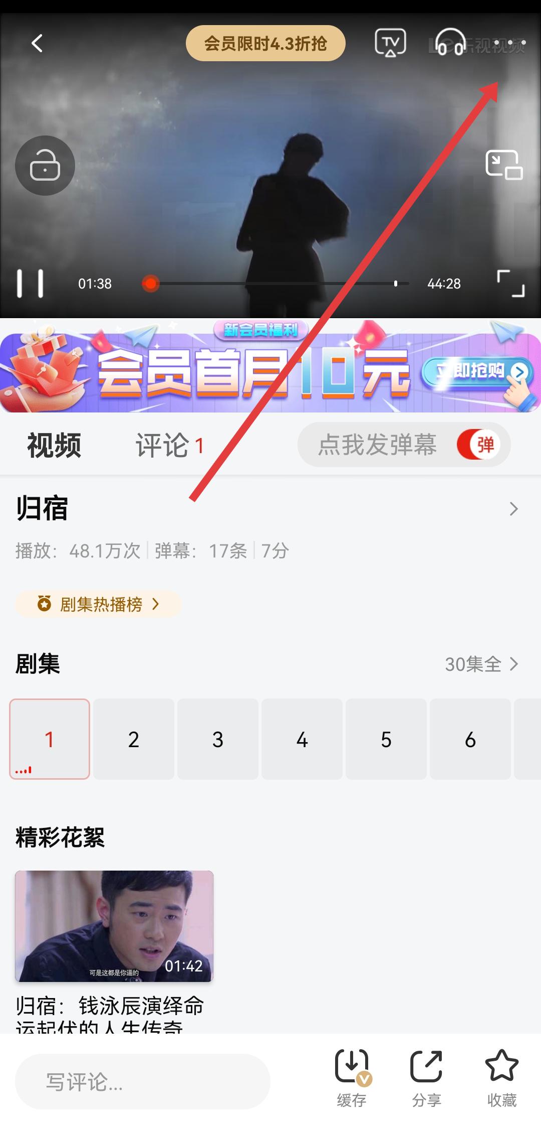 1、打开乐视视频APP,需要进入目标视频的播放界面,点击右上角的三点图标。