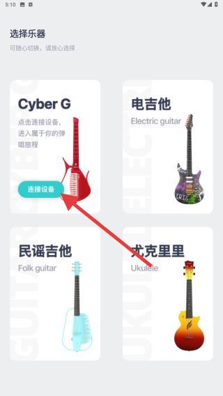 2、进入到软件内根据提示选择乐器,再进行连接设备,包含了:CyberG、电吉他、民谣吉他等。