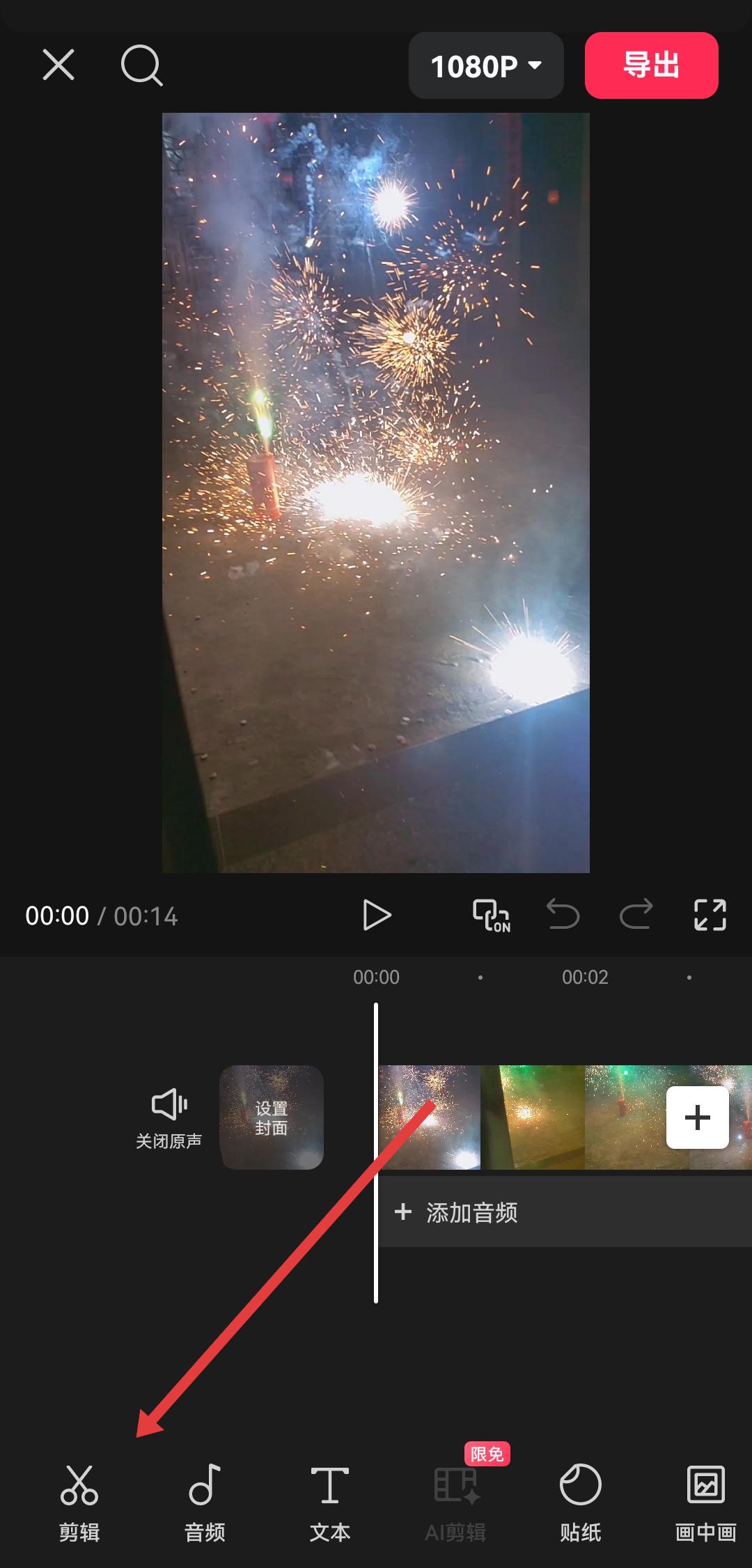 2、在视频编辑页面的底部,需要点击剪辑的选项,展开剪辑的功能栏。