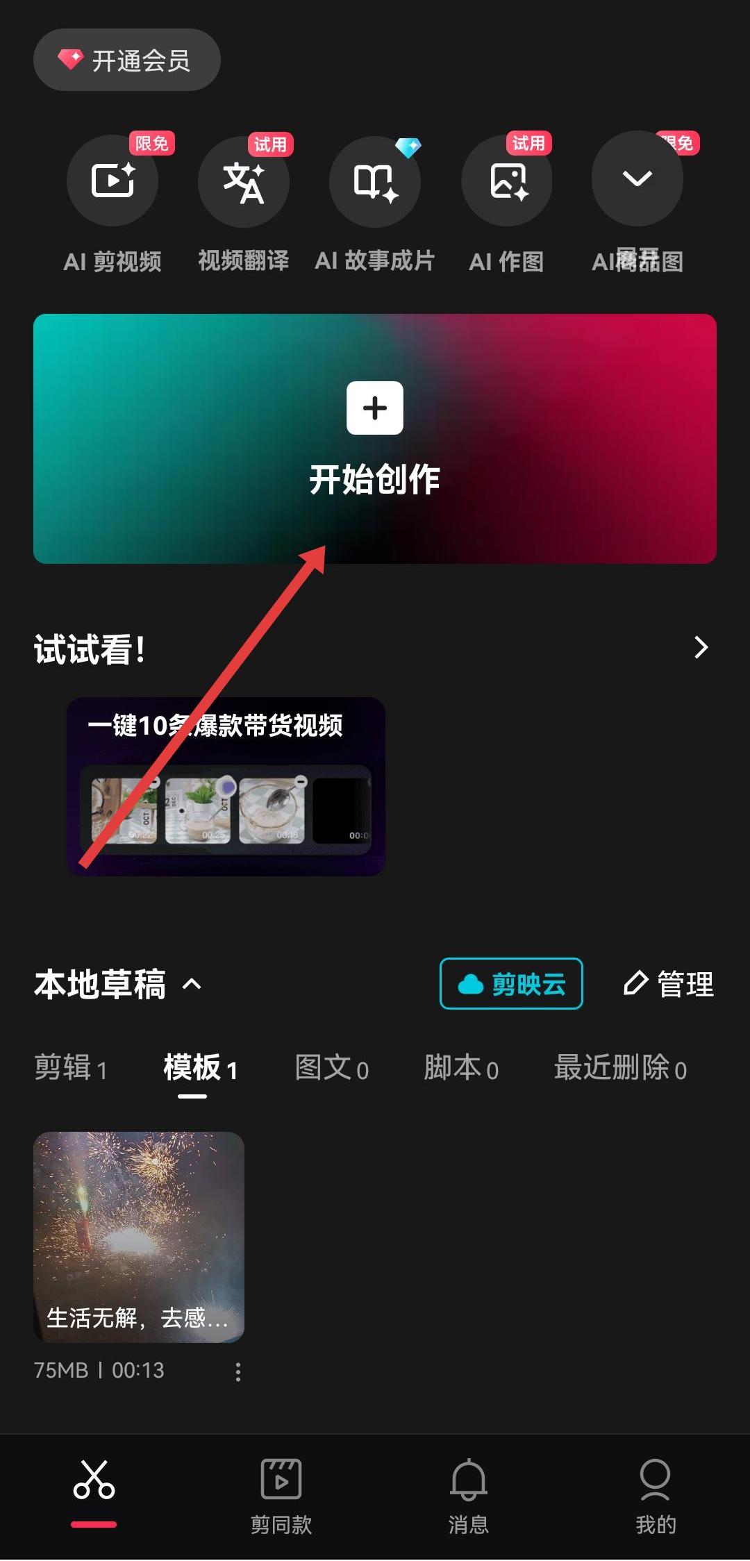 1、打开剪映APP,需要点击开始创作导入需要剪辑的视频,进入视频编辑的页面。