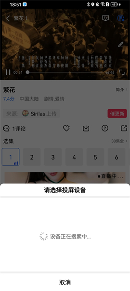 4、悬浮窗权限打开后,再次点击“TV”投屏按钮,即可搜索本地可连接的投屏设备,点击目标设备即完成投屏操作。