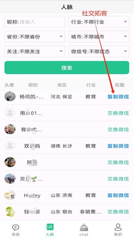 二、人脉拓客:支持人脉搜索、交换及微信、即时通讯等