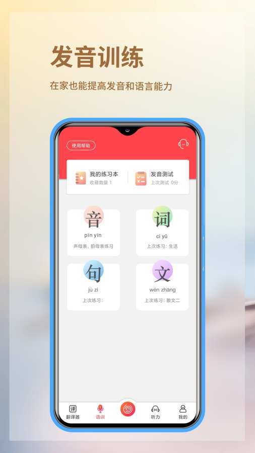 3.语音训练:运用AI智能评测技术给你发音打分,分为拼音、单词、句子和文章四个训练板块有效提高你的普通话水平!