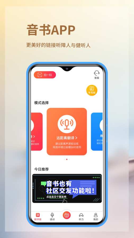 音书APP,一款专为听障人士(听障人/老年听损者/聋人/聋哑人)设计的语音转文字软件。软件主要有语音转文字、口语训练和听力三大服务,从视觉、表达和听觉全方面提高听障人士的信息获取能力,采用的语音识别技术可帮助听障人获取4米内人说话信息、电视、电脑、音箱等扬声器的声音。音书APP的使用者包括听障人士、老年耳聋耳背群体、志愿者以及其他需要与听力残疾人士沟通的人群。