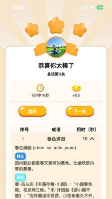 • 激励学习:在轻松愉快的氛围中掌握成语、诗词知识,并通过丰富的奖励机制和排名榜单,激发孩子的学习斗志与成就感。