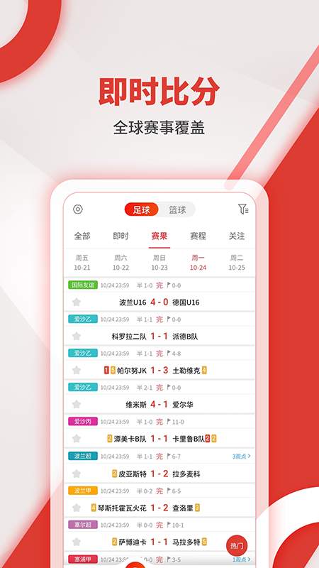 超全的赛事数据,全球超过200个国家或地区,1000多个各级赛事的体育比分、足球比分、篮球比分、滚球比分、足彩比分、即时即刻比分直播(利物浦、切尔西、阿森纳、巴萨、皇马、尤文、国米、曼联、拜仁、热刺,湖人、勇士、雄鹿等强队对决都在这里;C罗、梅西、库里、詹姆斯等巨星风采均可尽收眼里)。