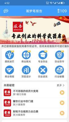 「画梦笔报告」是由北京画梦笔信息系统科学研究院有限公司开发的一款针对创新创业者、中小微企业的学习和服务类软件。在画梦笔报告软件中,有关于创新研发基础科学信息,宏观的创业视野,专业的创业能力,顶层的创业设计,前沿的行业讯息,创业进攻原理干法,识别及防范创业风险等各类创业研究报告,帮助创业者获得专业创业能力,实现自主创业设计,先知前沿市场信息,辅助商业决策,解决创业创新难题,让你的创业紧跟时代步伐。