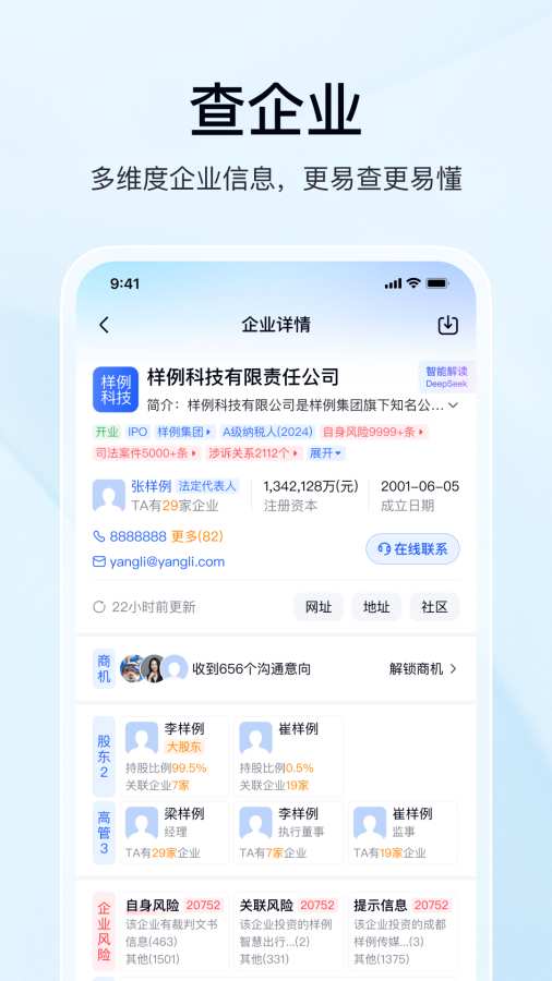 【产品功能】查企业、查老板、找关系、查老赖、查商标、查地图、风险监控、高级检索、数据导出等多项查询服务免费使用;为用户提供便捷;