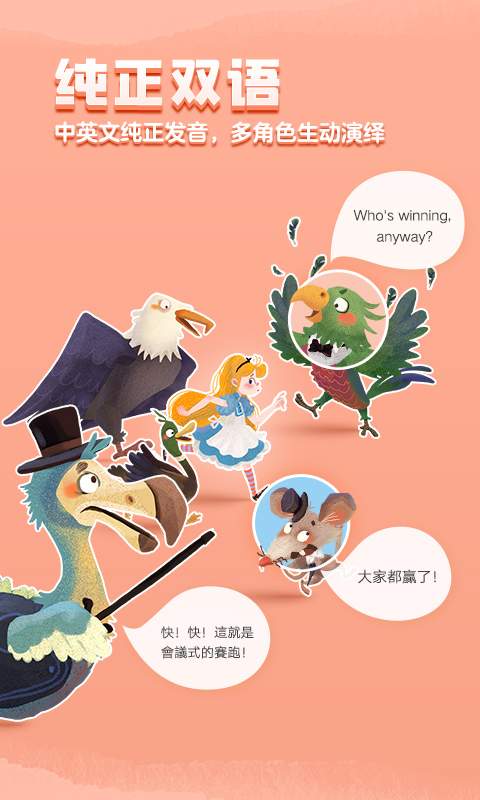 2. 听双语,更纯正:中英文双语一键切换,专业儿童故事配音员分角色生动演绎,专业音效等后期制作烘托,帮助孩子插上想象的翅膀,体验声情并茂的故事场景