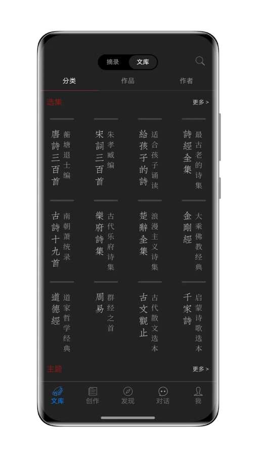 【精选分类】对100万诗词进行分类,包括:选集、主题、写景、节日、节气、词牌、时令、用典、地理、名山、城市、时间、花卉、小学、初中、高中等。