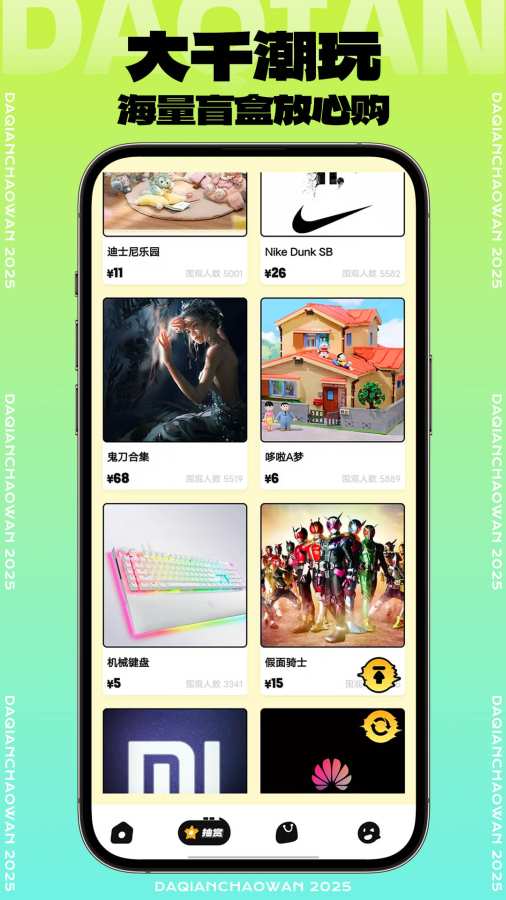 在大千潮玩,我们致力于为每一位玩家带来心跳加速的惊喜体验!我们深知大家对盲盒的热爱,更明白大家渴望中奖、追求稀有款的心情,所以在这里,我们精心打造了一个充满无限可能的盲盒世界,在这里,你可以找到自己心仪已久的宝贝,也可以发现那些意外之喜,每一次选择都是一次新的冒险。 来自应用汇: 大千潮玩