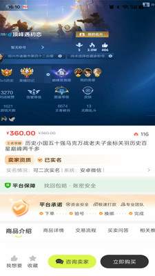 专业的安全可靠的游戏账号交易平台,所有游戏全免手续费,并提供终身包赔服务,极速打款结算,强大的售后服务和生态让你的账号售卖更快。 来自应用汇: 卡卡账号