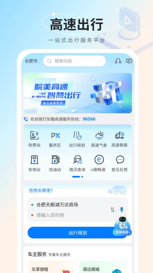 3. 实时路况查询,实现路况查询、出行路径规划、预约出行、路况订阅、导航与语音播报,快速查看高速线路沿途充电桩、加油站、服务区、收费站、路况、省/市/县天气预报与天气预警信息。