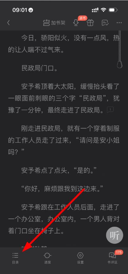 2、进入阅读界面后,轻触手机屏幕的中间位置或点击屏幕下方空白处,此时会弹出包含多项功能的底部菜单栏,在菜单栏里找到并点击目录按钮。