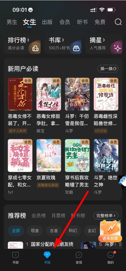 1、打开软件进入书城页面,在各类书籍推荐区域如排行榜、新用户必读、推荐榜等中,找到自己想要阅读的书籍,点击书籍封面,进入书籍的阅读界面。