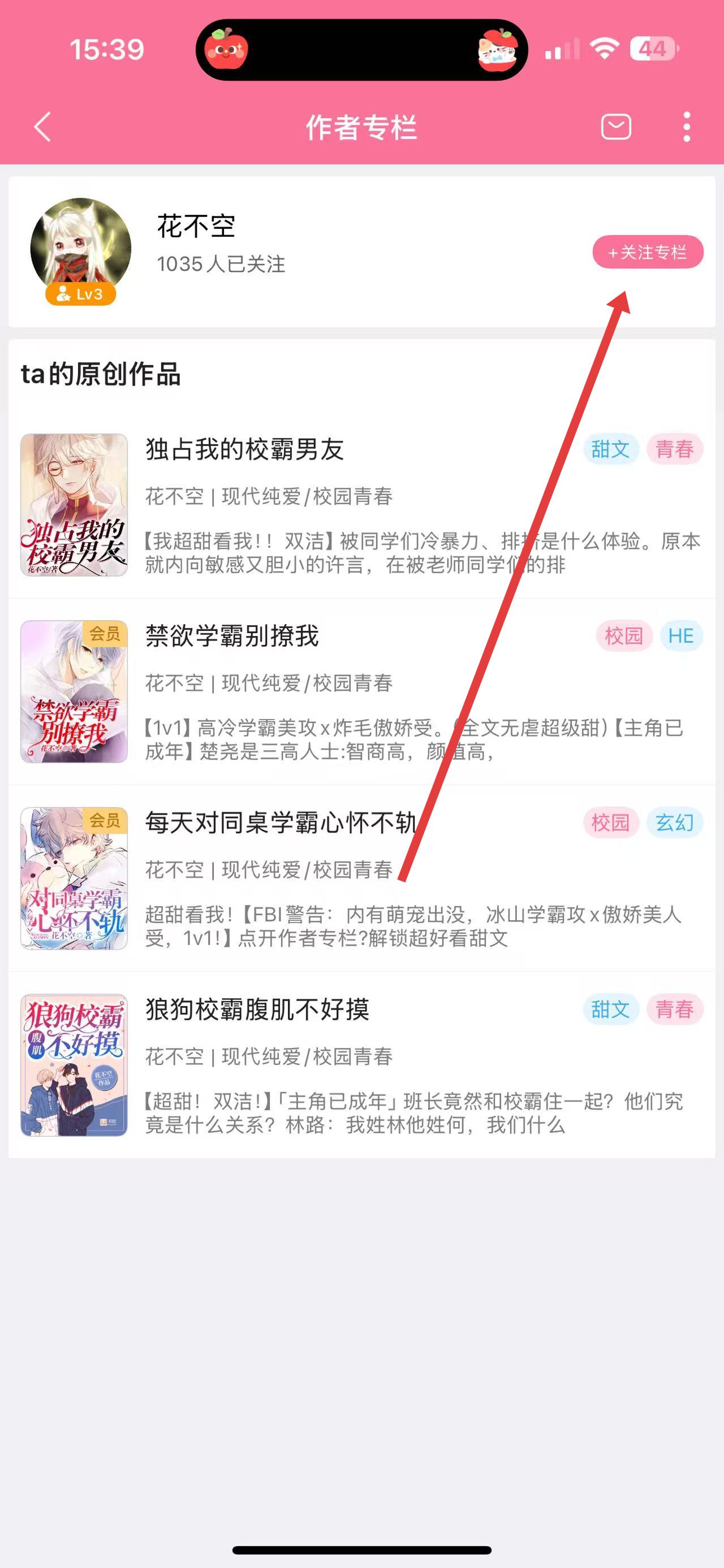 2、进入小说独占我的校霸男友详情页后,点击作者专栏选项,进入作者相关页面。