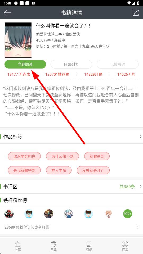 1、在欢乐书客中找到想要阅读的小说,进入其书籍详情页面点击立即阅读。