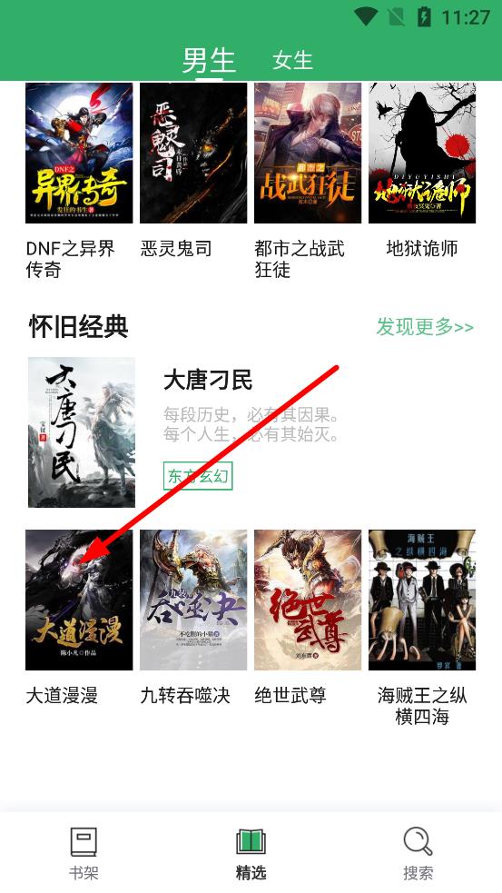 1、打开txt全本免费全小说App,在精选等页面找到想缓存的小说,比如点击小说《大道漫漫》。