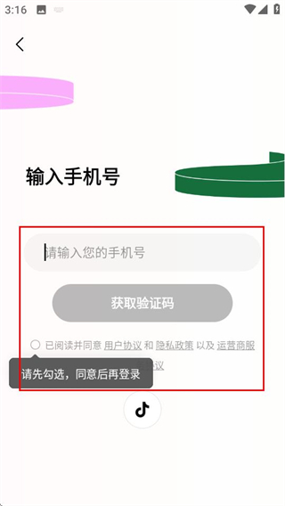 3、在登录页面,填写信息并勾选协议后,即可完成账号登录。