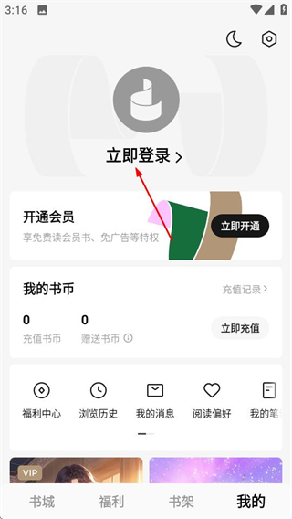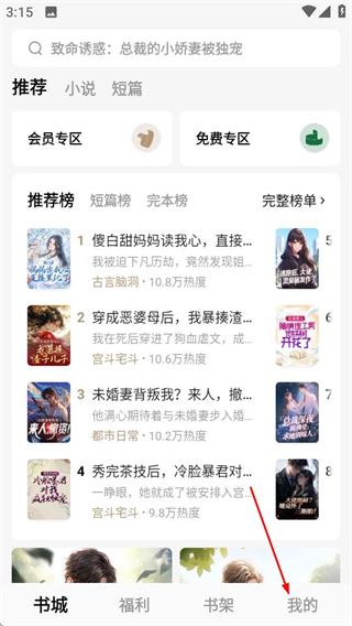 1、在红烛小说书城页面,点击底部的我的选项,进入个人中心页面。