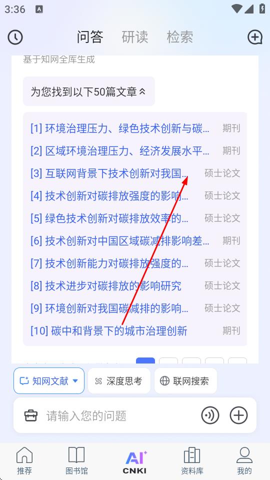 1、打开全球学术快报App,进入AI问答界面,点击知网文献按钮,输入相关问题。