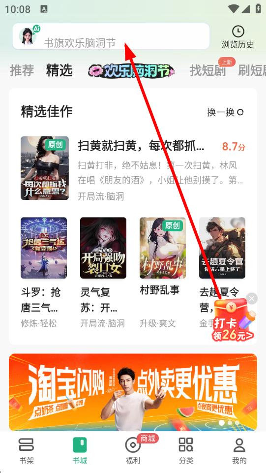 1、打开书旗小说APP,进入书城界面,点击屏幕上方的搜索框,准备输入书名。