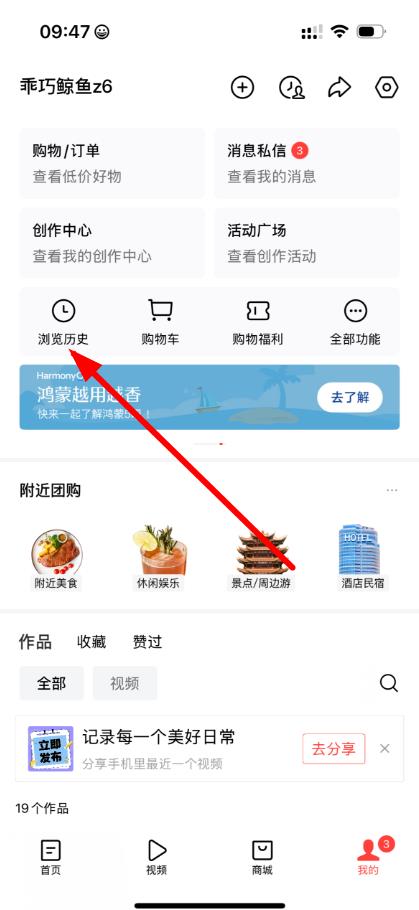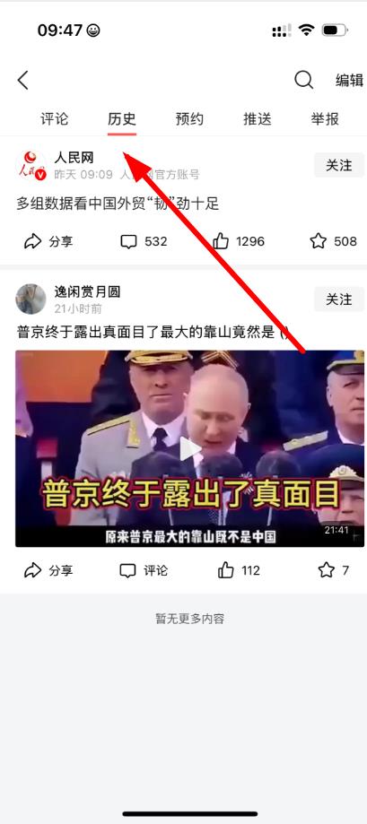 3、进入浏览历史页面后,点击历史标签,即可查看之前浏览过的内容。