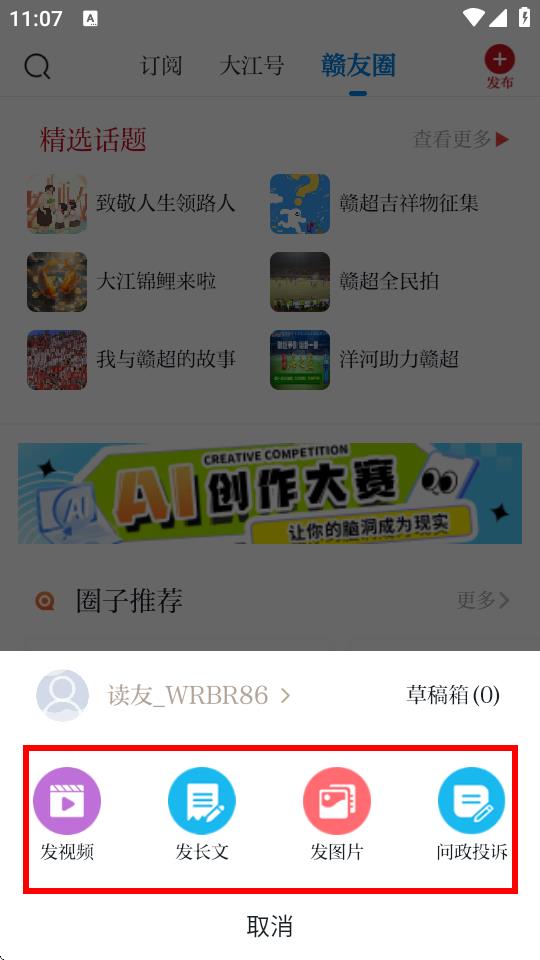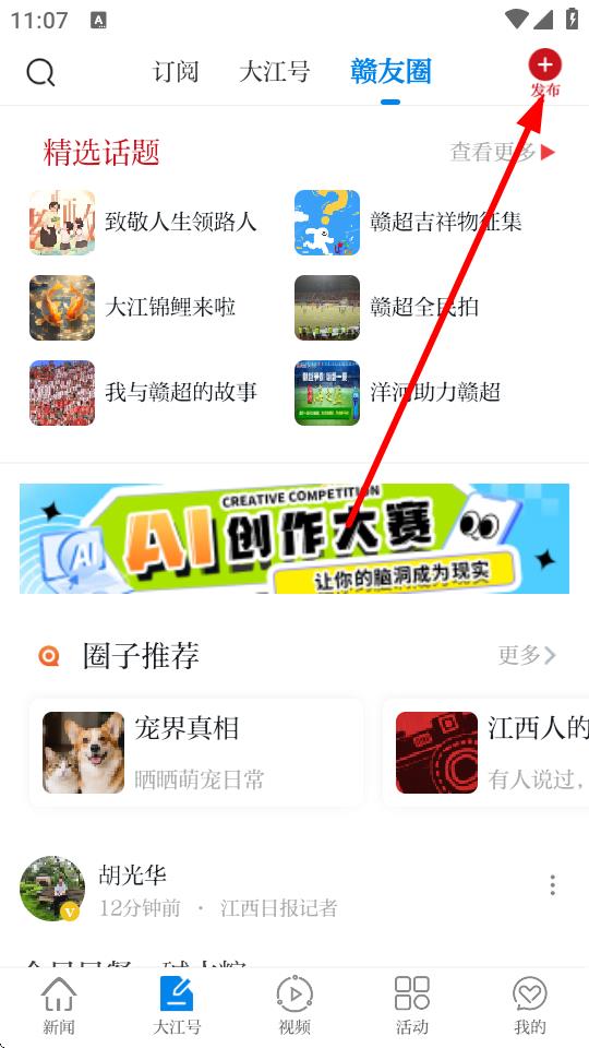 2、在大江号页面,点击右上角赣友圈区域的发布按钮。