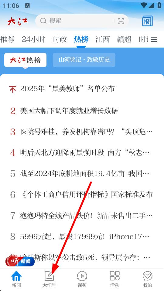 1、打开大江新闻App,点击底部导航栏中的大江号选项。