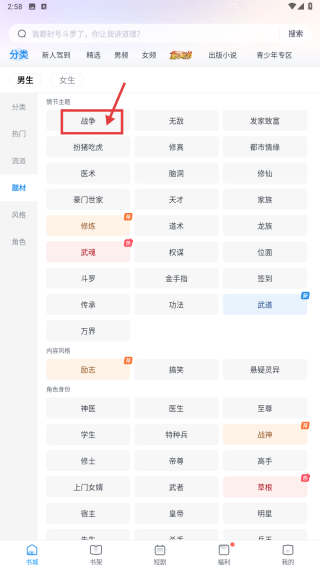 2、在分类页面,选择男生分类下的题材选项,进入题材筛选界面。
