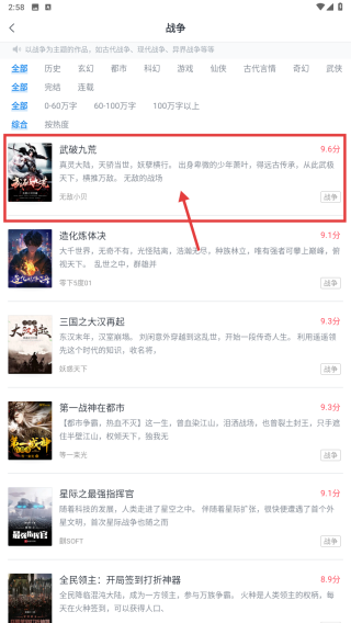 3、在题材筛选界面,点击战争分类,进入战争题材小说列表。