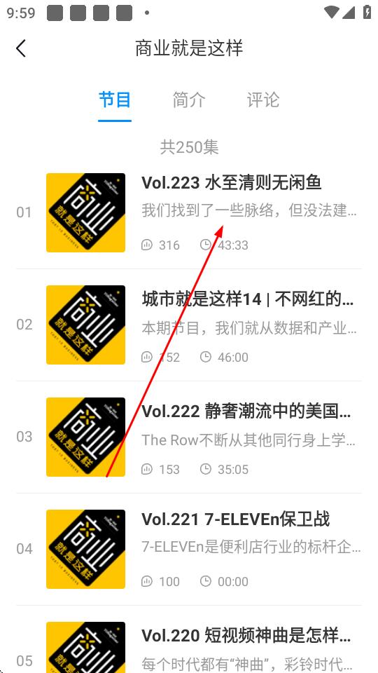 3、进入节目页面后,会看到各个音频集数列表,选择想听的集数,点击进入。