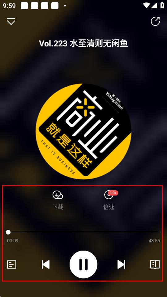 4、进入音频播放页面后,即可进行播放、暂停、倍速、下载等操作来收听节目。