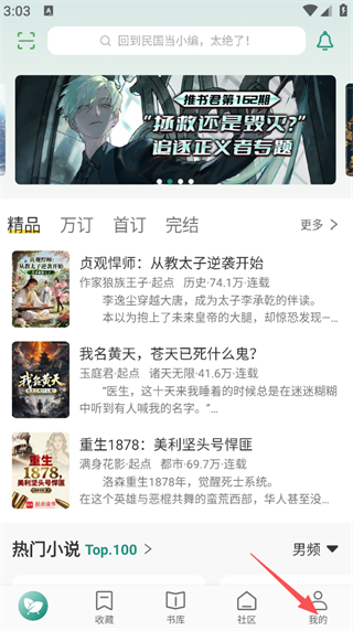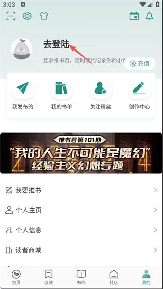 1、在推书君APP首页,点击底部的我的选项,进入个人中心页面。