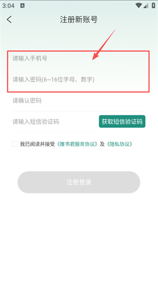 4、在注册新账号页面,填写请输入手机号、请输入密码,进入下一步的操作。
