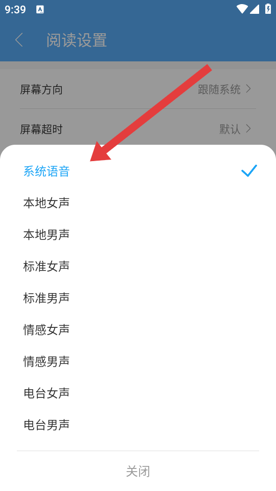 3、在阅读设置的界面,点击语音选择选项当前显示系统语音,弹出语音选择列表。