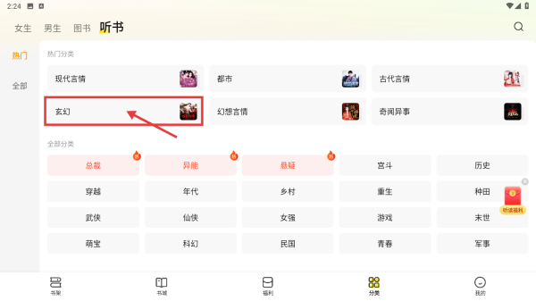 3、在听书板块,选择玄幻分类,进入玄幻听书列表。