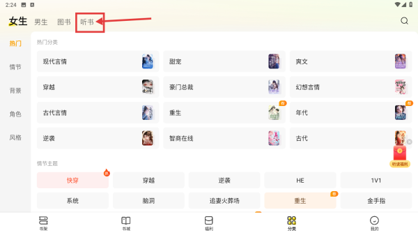 2、在分类页面,点击听书选项,切换至听书内容板块。