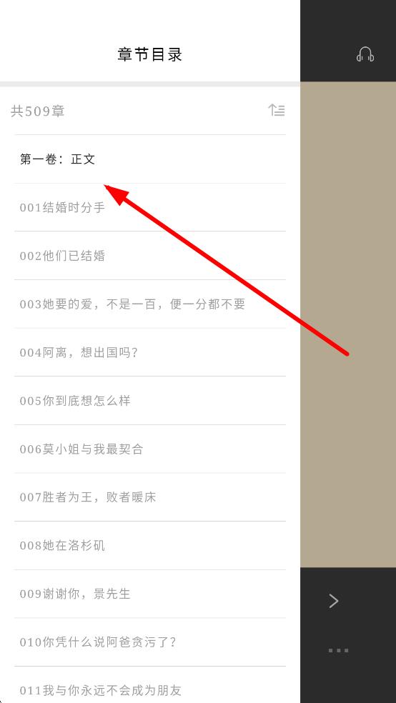 3、点击后会弹出章节目录界面,在该界面即可查看小说的章节内容,选择你想阅读的章节,如第一卷正文里的具体章节,点击即可跳转阅读。