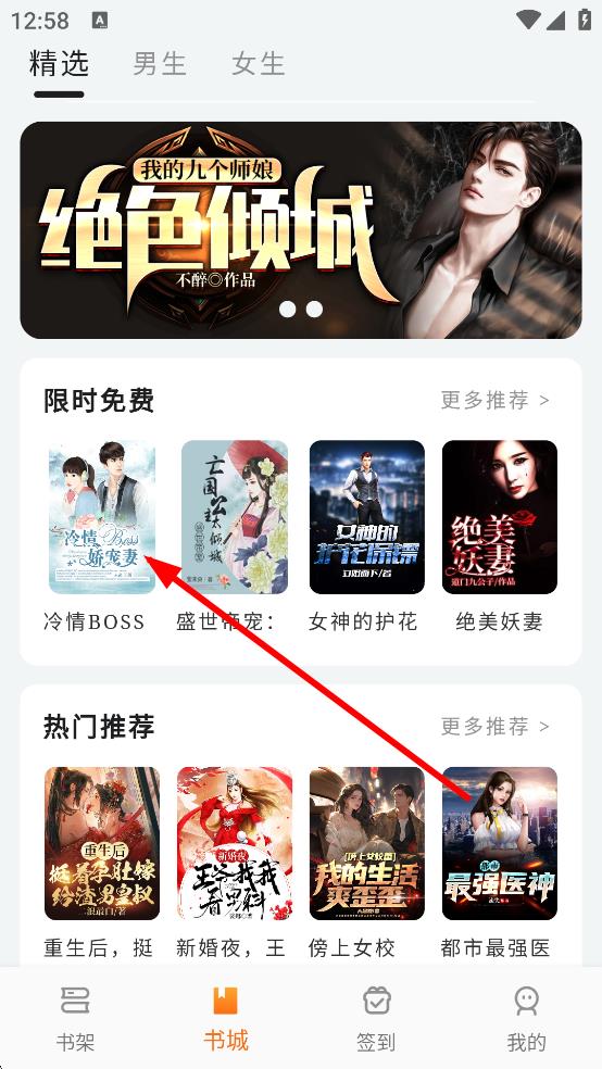 1、打开书丛小说app,点击下方书城,在页面中选择想要阅读的小说,如限时免费区的《冷情BOSS娇宠妻》。