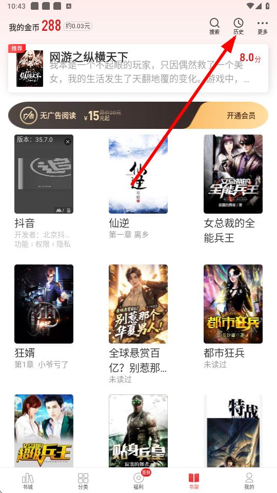2、在书架页面右上角找到历史图标并点击。